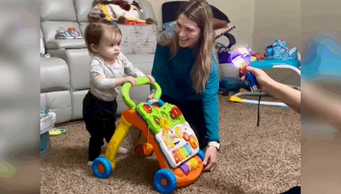 Since working with the early intervention specialist since August, Aurora has since achieved goals to roll over, army crawl, traditional crawl, pull-to-stand, and so much more. She is also now taking steps while holding onto the couch and while using a push toy, as you can see in the social media post below.
